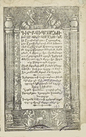 ԺԲ, ԴՃԻԸ [441] զարդափակ էջ։ Ութածալ, մամուլանիշերը հայատառ։ Շարվ. չափը՝ 15,8X11 սմ: Էջախորագրերով և լուսանցանիշերով։ Տիտղթ. արձանազարդ։ 3 փորագրր պատկեր ը էջի դարձերեսում, ճզ և ճէ էջերի միջև։ Գլխազարդեր, վերջազարդեր, լուսանցազարդեր, զարդագրեր։ Բնագիրր 12 կետաչափի բոլորագրով, օգտագործված են նաև գլխագրեր։